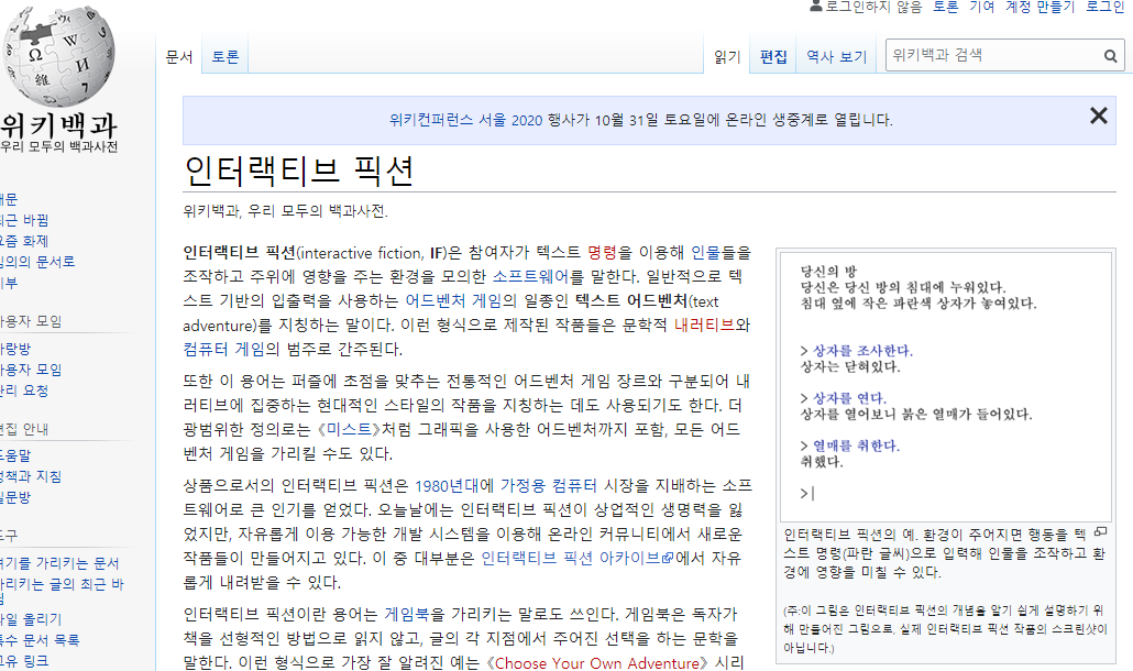 IF(Interactive Fiction)이라는 단어를 우연하게 찾아보게 되었다. 80년대에 Apple IIe에서 보았던 텍스트기반(물론 이미지는 있었다) 어드벤쳐 게임이 IF에 속한다. 그 당시 미치게 재미있게 했던 "트렌실베니아", "mask of the sun"같은 게임이다.