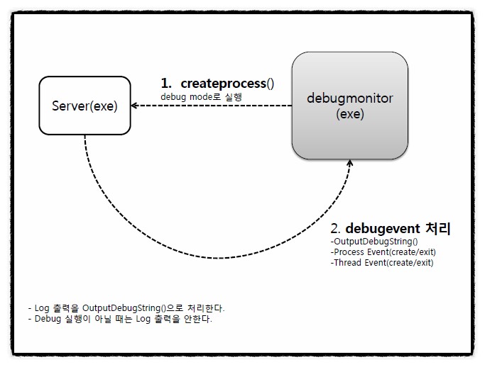 그러므로 서버 개발(또는 디버깅)을 할 때는 디버깅 메시지가 출력되고 실제 서비스 될 때는 디버깅 메시지가 출력 안되게 할 필요가 생긴다. 이런 목적을 달성하기 위해 windows의 OutputDebugString() 함수와 Debugging API를 사용해보도록 한다.
