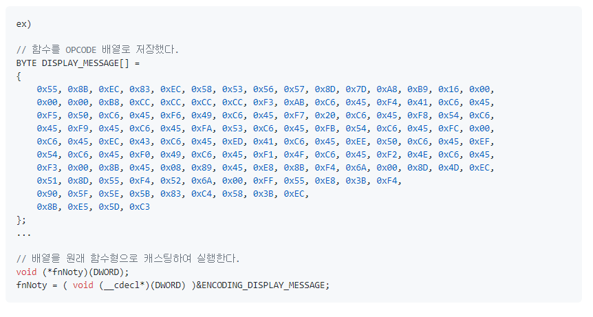 여기서 눈여겨보아야 할 것은 "경고메시지 함수"인데 OPCode(어셈블리)를 배열로 만들었다. C를 배우면 많이 언급되는 내용 중에 하나가 "함수도 포인터이다"라는 말이 있는데, 그것을 재대로 이해했다면 모든 함수의 OPCode를 배열로 만들고 함수로 캐스팅하면 실행되는 것을 알 수 있다.