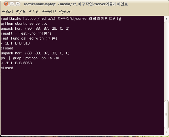 - 클라이언트에서 ps | grep 'python' && ls -al 을 리눅스 쉘 명령어로 요청한다.