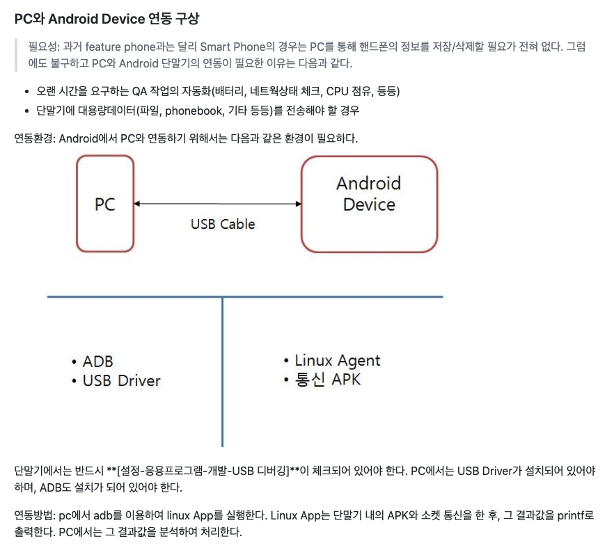 단말기에서는 반드시 [설정-응용프로그램-개발-USB 디버깅]이 체크되어 있어야 한다. PC에서는 USB Driver가 설치되어 있어야 하며, ADB도 설치가 되어 있어야 한다.