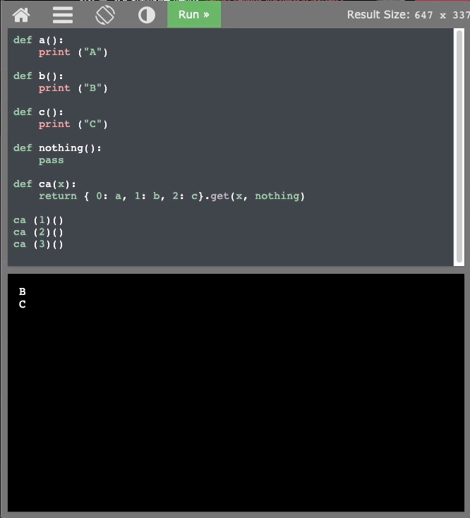 여기서 유의할 점은, 딕셔너리를 정의할 때, value에 함수명을 입력하는 것이다. 그리고 딕세녀러의 get 함수를 이용하여 함수를 가져온다. case 문의 디폴트에 대항하는 부분은 get 함수의 두번째 파라메터로 정의한다. 그리고 딕셔너리에서 가져온 value는 함수의 주소값이므로 그 값에 ()를 붙여주어야 실행이 가능하다.