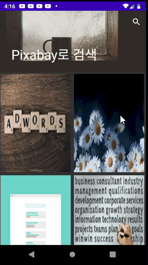 - 무료 이미지를 검색합니다. - Open API를 사용했습니다. - 전체소스는 다음에 있습니다. https://github.com/VintageAppMaker/SearchPixaby