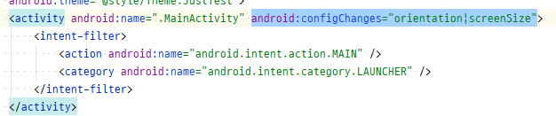<activity android:name=".MainActivity" android:configChanges="orientation|screenSize">