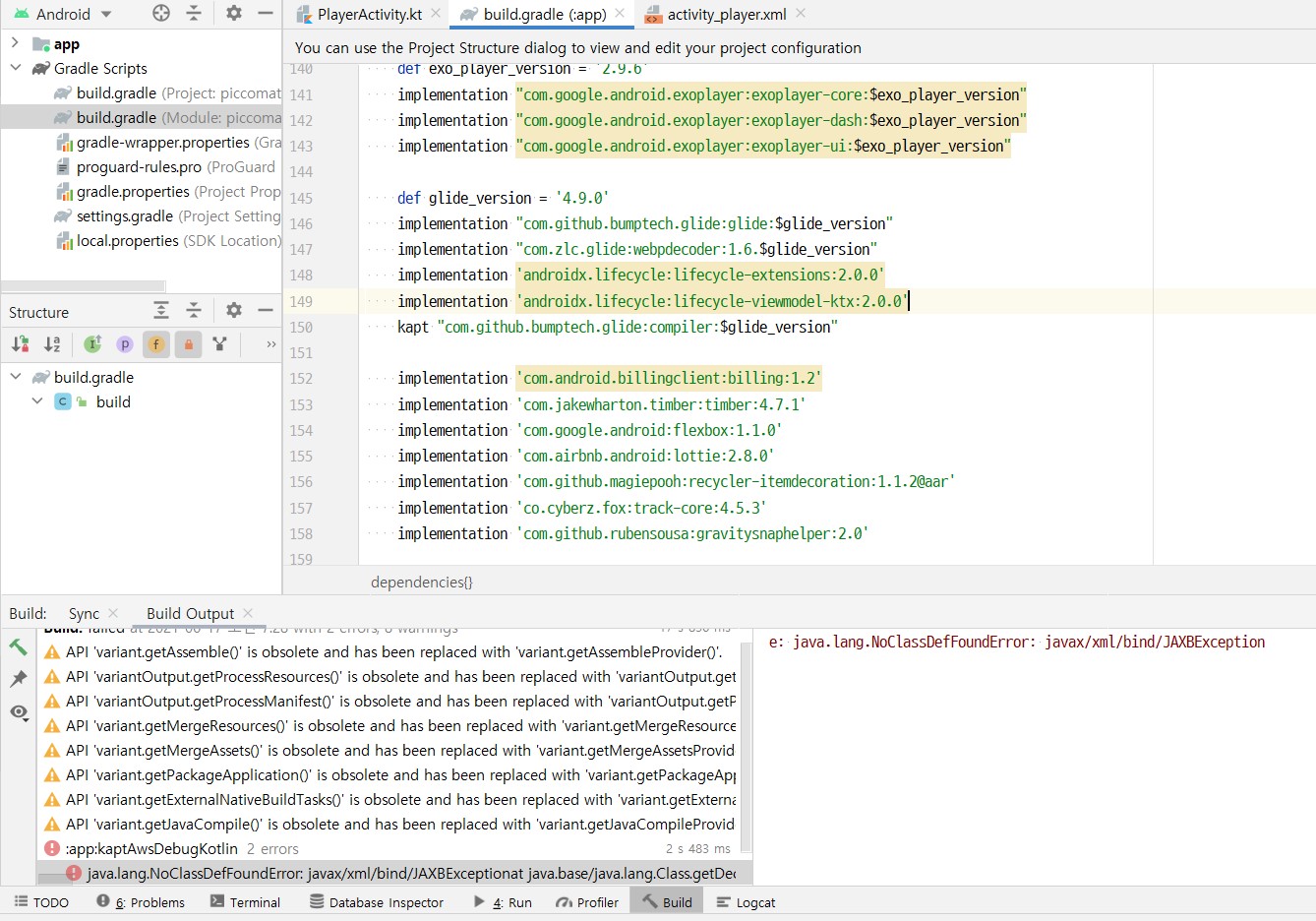 자바버전 에러이다. 자바의 버전이 업그레이드 되면서 이전의 종속성 몇 개가 삭제되었는데, gradle에서 수동으로 추가해주어야 한다. 문제는 어떤 개발환경에서는 java 1.8 환경으로 되어 있기에 java 1.8이상을 사용하는 PC 처럼 종속성을 지정하기에 껄끄러운 경우가 발생한다는 것이다. 그럴경우,
