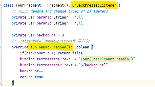 (2) Fragment에서는 OnBackPressedListner를 구현상속한다. 그리고 원하는 내용을 구현한다.