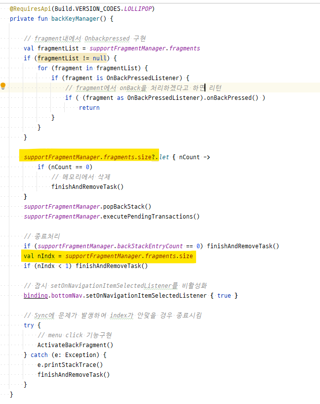 ▶ backStackEntryCount와 fragments의 개수를 다시검사한다. 없다면 Activity를 종료한다.