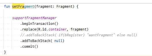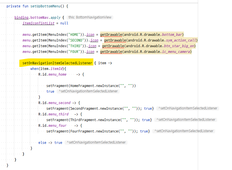 그리고 setOnNavigationItemSelectedListener에서 하단메뉴를 클릭시, 원하는 Fragment로 이동하기 위해 위에서 구현한 setFragment 함수를 호출한다.