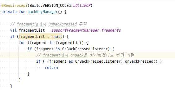 (3) Activity에서는 onBackPressed에서 복귀된 Fragment가 Interface를 구현상속한 Fragment인지 채크한 후, 구현된 메소드를 호출해준다.