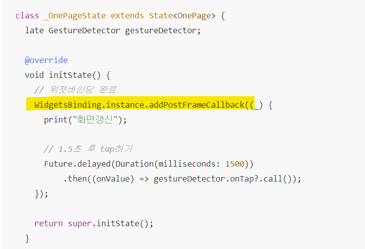 WidgetsBinding.instance.addPostFrameCallback()을 사용한다. 주로 stateful 위젯의 initState()에서 구현해준다.