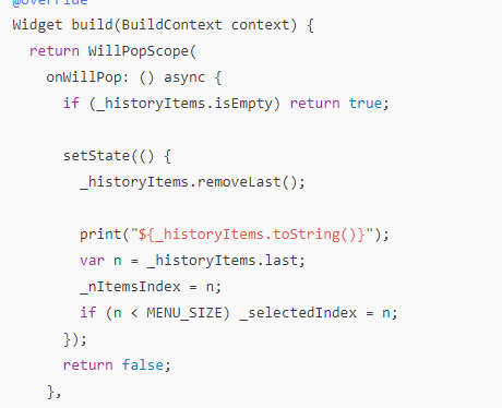 다른 플랫폼과 달리 Android에서는 하단메뉴가 존재하는 UI에서는 back 키를 눌렀을 때, 이전화면으로 가는 UX가 요구될 때가 있다. 그럴 경우, Android에서는 onBackPressed() 메소드를 오버라이드한다. 이와 비슷하게 Flutter에서는