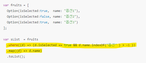.where((d) => (d.isSelected == true && d.name.indexOf("옵션" ) > -1 ))