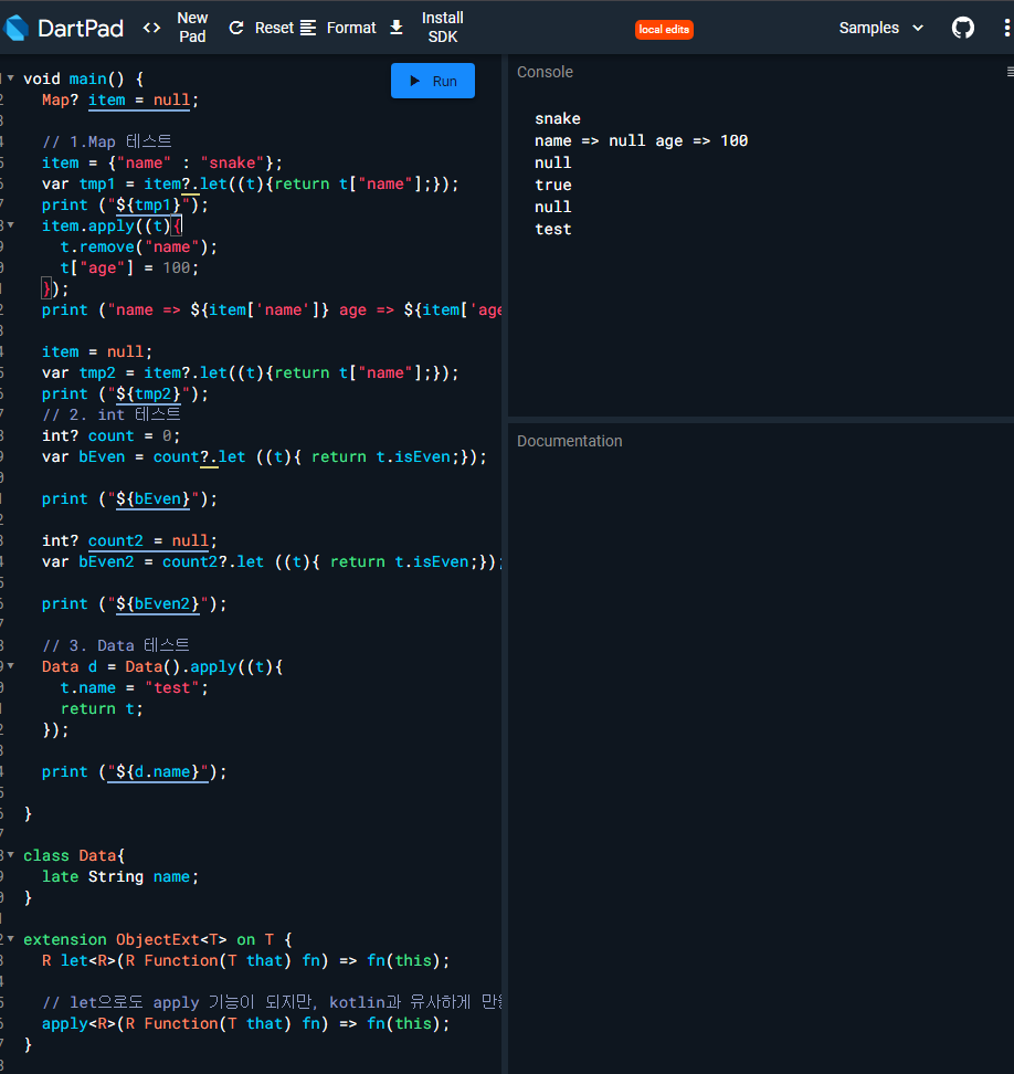 dart에서는 kotlin과 같이 null safety를 위한 내장된 확장함수인 let(), apply() 같은 함수가 존재하지 않는다.
