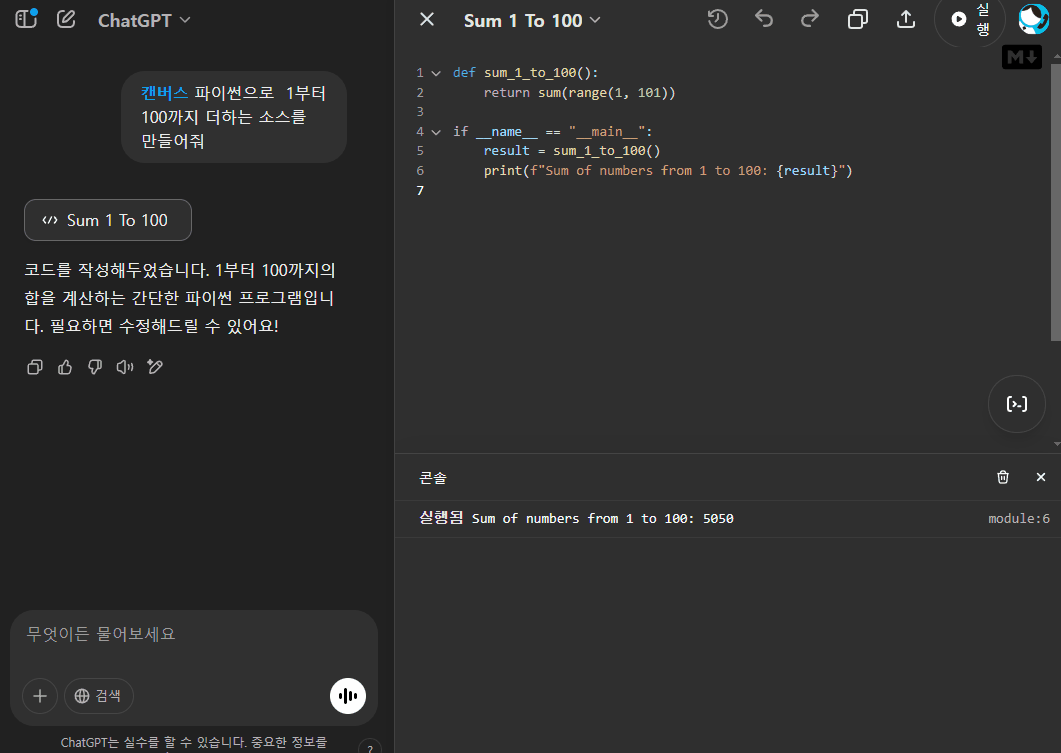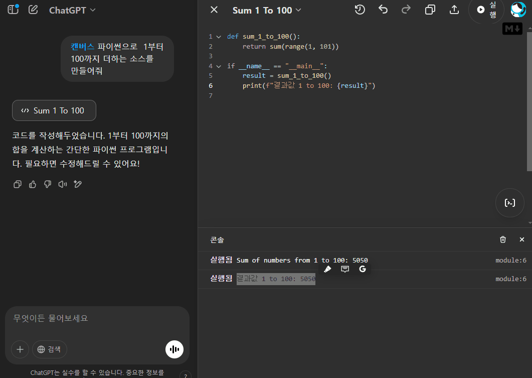 3. 프롬프트 진행 후, 캔버스 에디터에서 "소스코드"를 🔨수정, 🤖실행, 👨💻디버깅 할 수 있는 화면이 제공된다.