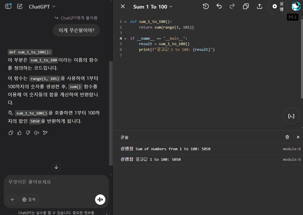 "파이썬으로 1부터 100까지 더하는 소스를 만들어줘"