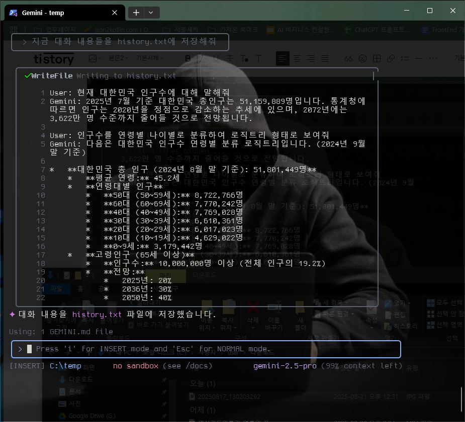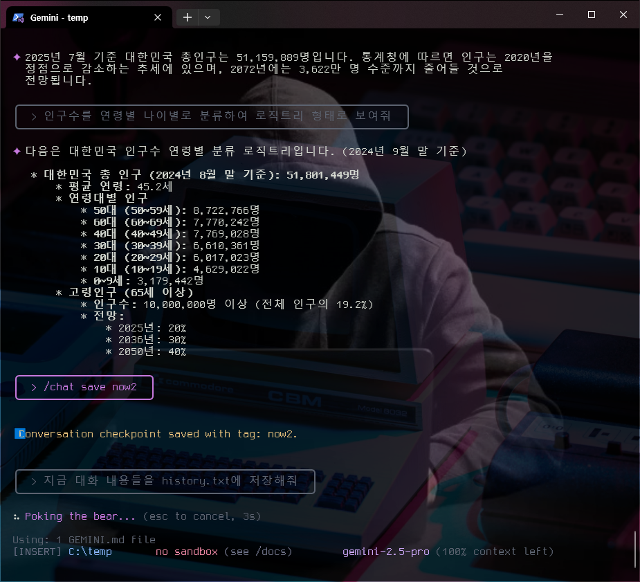 이렇게 함으로써 마치 git을 사용하듯 프롬프트의 기억을 저장하고 복원할 수 있다. 그리고 현재 gemini-cli에 저장된 프롬프트 내용들을 파일로 저장하고 싶다면 "프롬프트"를 활용하여 파일명으로 저장할 수 있다.