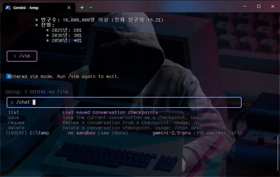 즉, gemini-cli를 사용하다가 터미널을 종료하더라도 나중에 새롭게 터미널을 열고 /chat resume 태그로 저장된 내용을 불러와 메모리(기억)을 이어갈 수 있다.