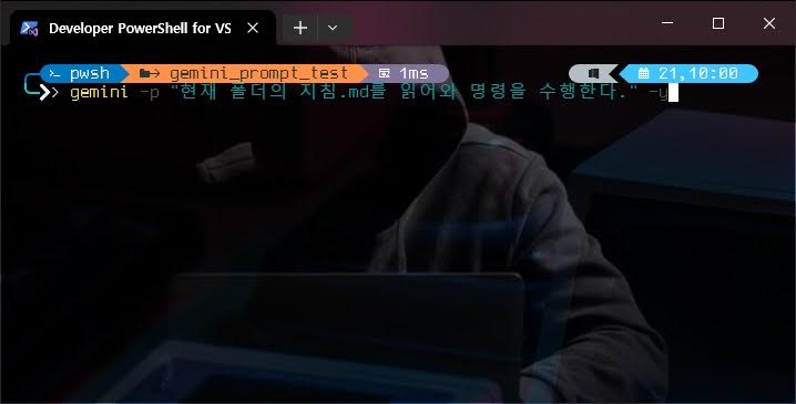 gemini로 자동화를 한다면 -p 옵션을 주고 "" 안에 프롬프트를 넘기는 방법을 사용하게 된다. 마치 python으로 프로그램을 실행시킬 때, python을 실행시키고 python shell 안에서 코드를 작성하는 것이 비현실적인 방법인 것과 마찬가지이다. python 내프로그램.py를 터미널에서 실행시키 듯이 gemini도 다음과 같은 방법으로 자동화를 실행시킨다.