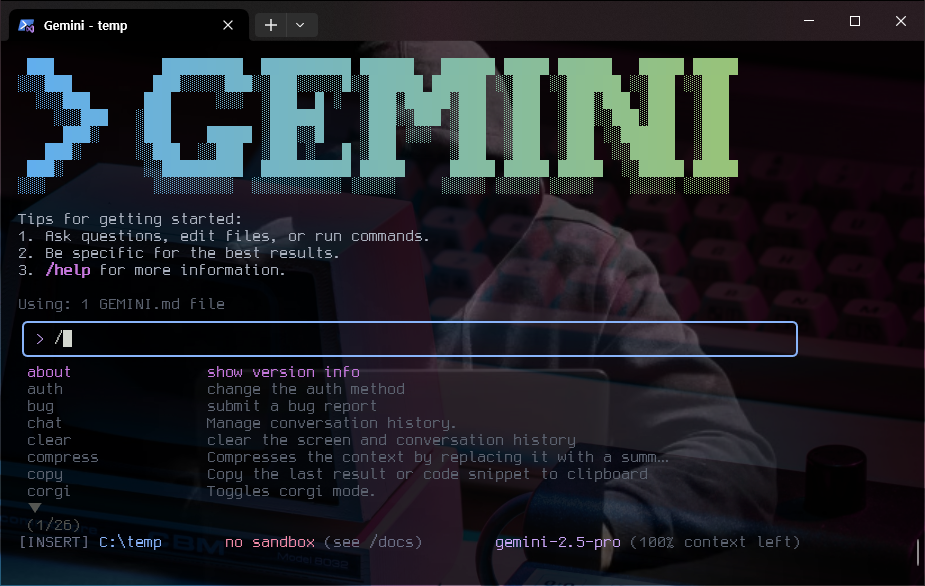 gemini를 실행한 화면에서 /를 입력하면 사용할 수 있는 커맨드를 볼 수 있다. 타이핑을 치거나 상하 방향키를 눌러서 커맨드를 선택할 수도 있고 그에 따른 설명도 볼 수 있다.