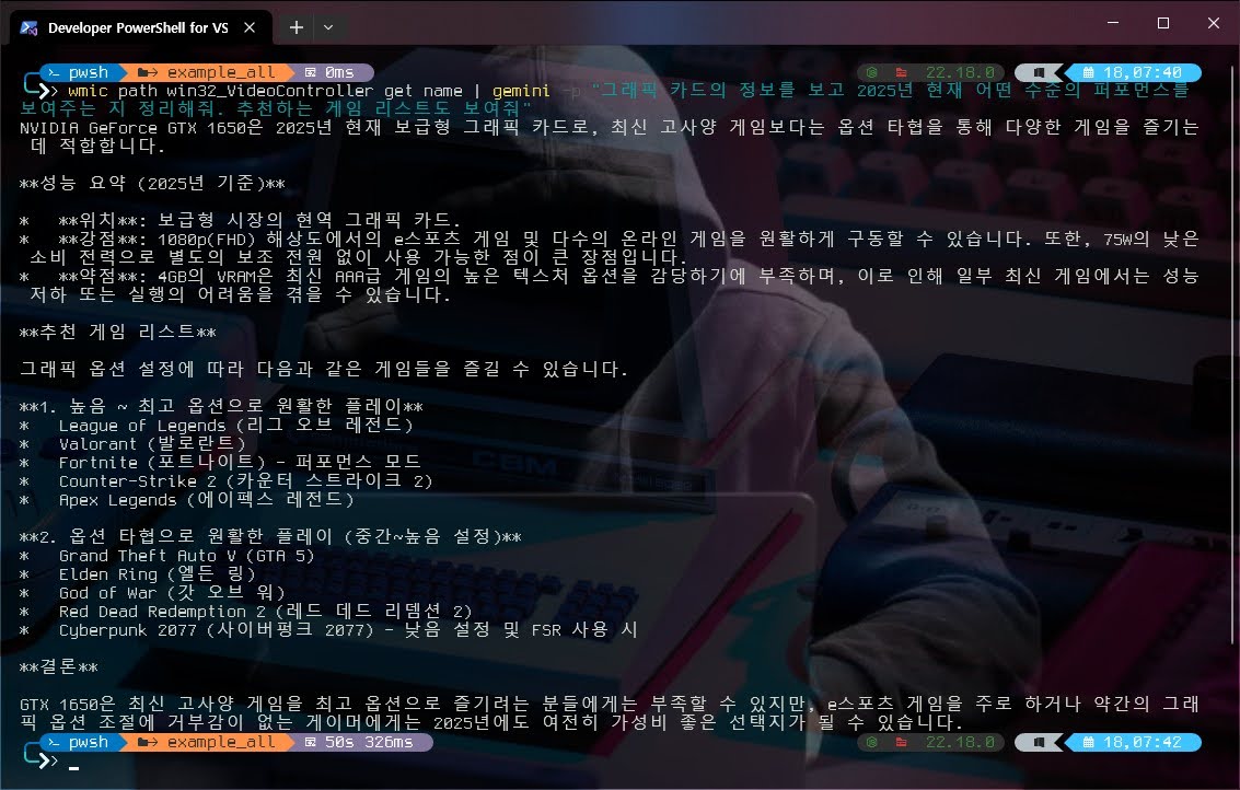 wmic path win32_VideoController get name | gemini -p "그래픽 카드의 정보를 보고 2025년 현재 어떤 수준의 퍼포먼스를 보여주는 지 정리해줘. 추천하는 게임 리스트도 보여줘"