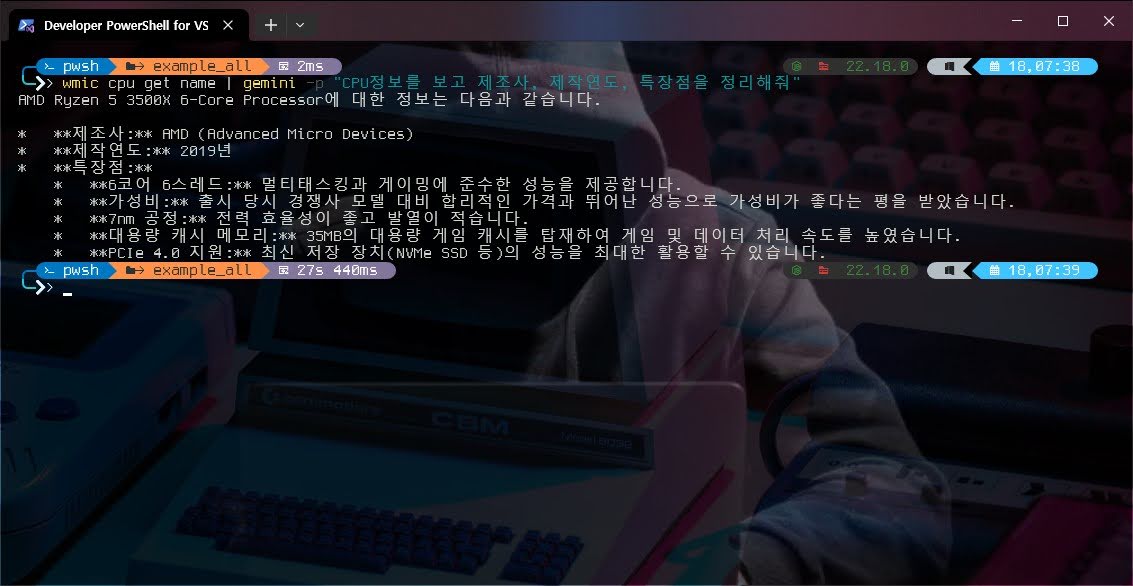 wmic cpu get name | gemini -p "CPU정보를 보고 제조사, 제작연도, 특장점을 정리해줘"