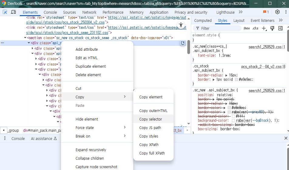 - 개발자 화면에서 선택된 요소로 이동하여 우클릭 후, copy -> Copy Selector를 선택한다.
