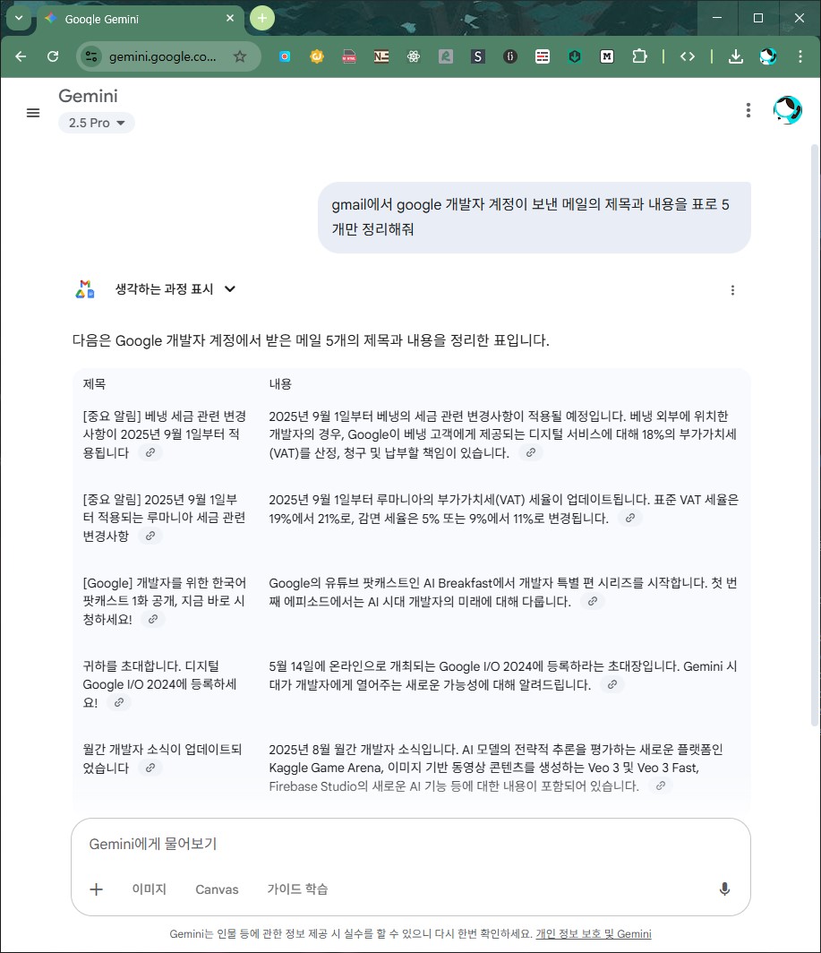 gmail에서 google 개발자 계정이 보낸 메일의 제목과 내용을 표로 5개만 정리해줘