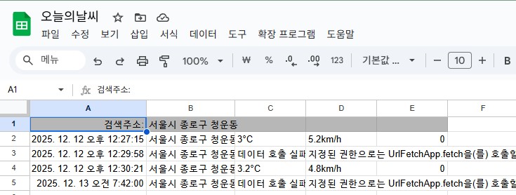 - 기능: 시트를 열 때마다 B1의 주소를 읽어와 해당 지역의 현재 기온과 풍속을 아래 행에 계속 누적합니다.