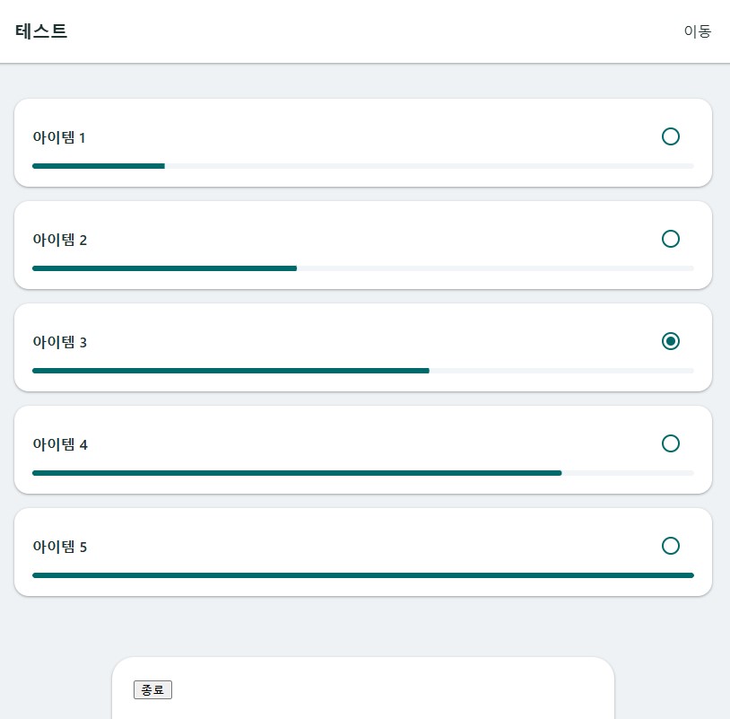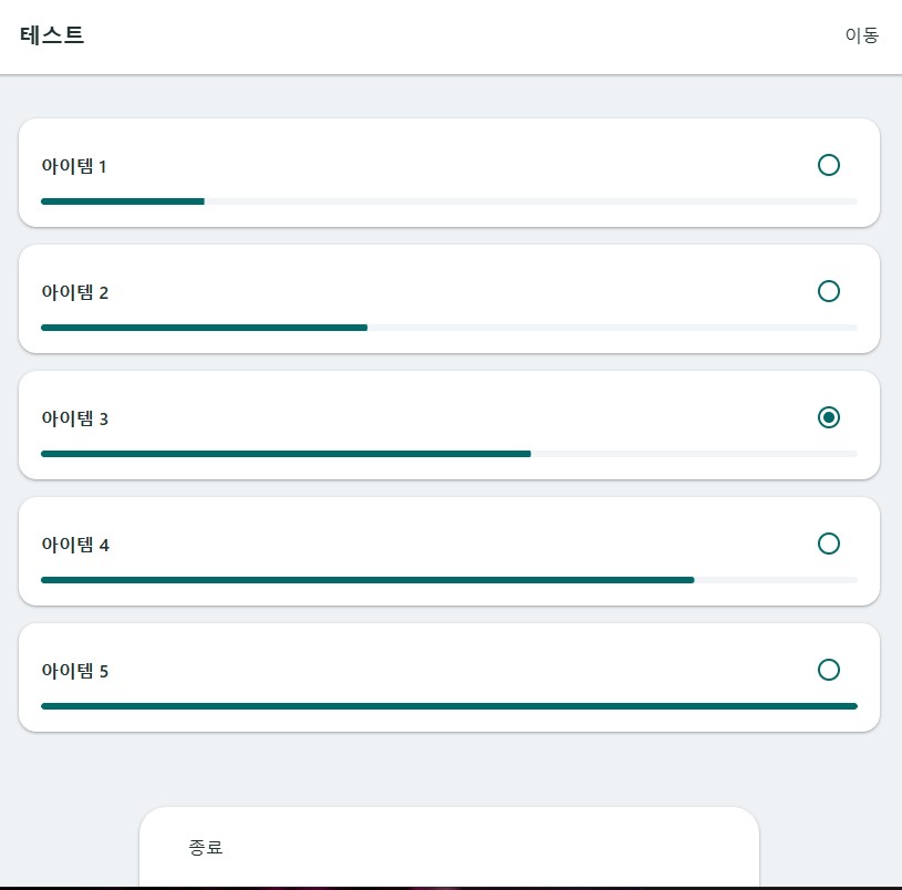 card 형태의 아이템에는 아이템 번호, progress radio 버튼이 존재한다.