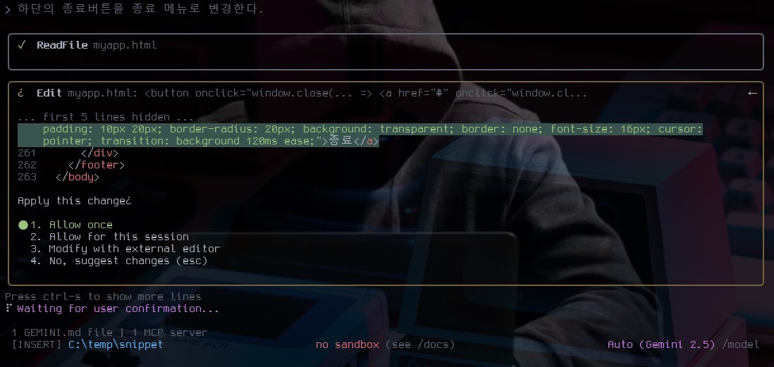 | [gemini-cli] mcp 활용 (이미지와 html 스니펫을 이용한 화면만들기) (0) | 2026.02.05 |