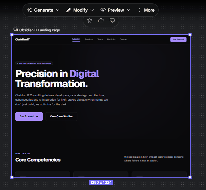 Stitch 2 에서는 생성된 디자인을 수정할 수 있다. 우측의 Floating 메뉴의 연필아이콘을 클릭한다. 그리고 디자인 내에서 수정을 원하는 아이템을 선택 후 직접 수정하거나 프롬프트를 통해 수정할 수 있다.