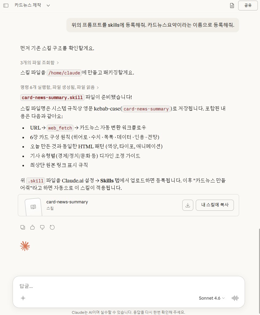 프롬프트로 생성된 결과가 마음에 든다면, skill로 등록하여 간편하게 같은 기능으로 재사용 가능하다. 다음과 같은 간단한 프롬프트만 요청하면 된다.